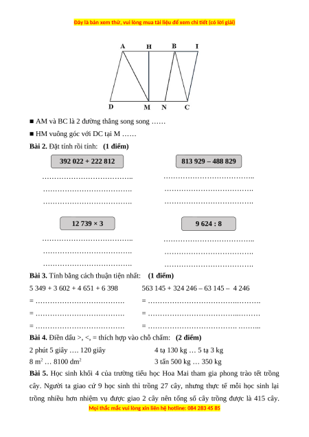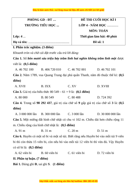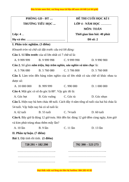 LỚP 4 - NĂM HỌC .............. MÔN: TOÁN Lớp: 4 ...