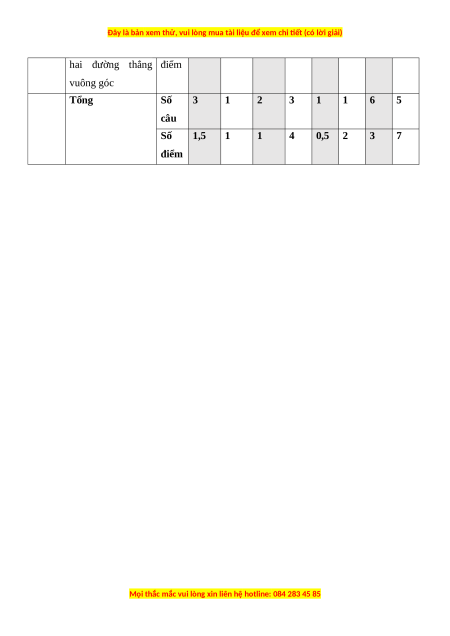 hai đường thẳng điểm vuông góc Tổng Số 3 1 2 3 1 1 6 5 câu Số 1,5 1 1 4 0,5 2 3 7 điểm