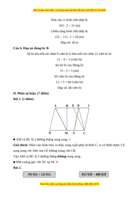 Câu 5. Một miếng đất hình chữ nhật có chu vi 102 m. Chiều dài hơn chiều rộng 11