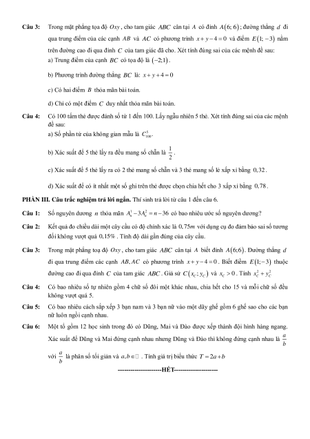 Câu 3: Trong mặt phẳng toạ độ Oxy , cho tam giác ABC cân tại A biết đỉnh A6;6. Đường thẳng d