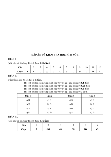 (Mỗi câu trả lời đúng thí sinh được 0,25 điểm) Câu 1 2 3 4 5 6 7 8 9 10 11 12 Chọn B C C A D C D C D D D A PHẦN II.