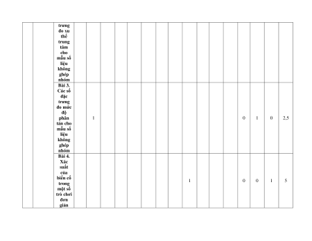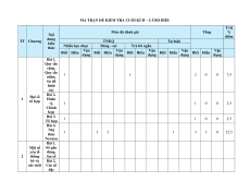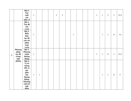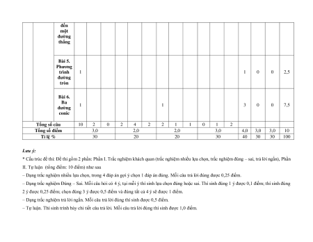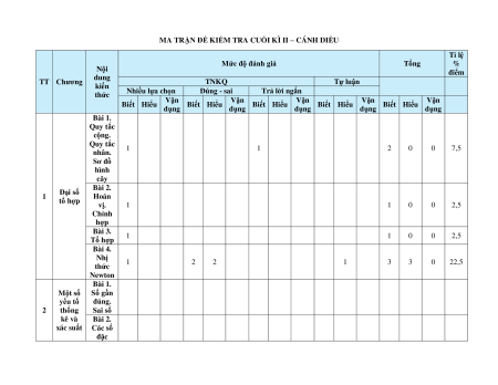 Mức độ đánh giá Tổng % Nội điểm dung TT Chương TNKQ Tự luận kiến Nhiều lựa chọn Đúng - sai Trả lời ngắn thức Vận Vận Vận Vận Vận Biết Hiểu Biết Hiểu Biết Hiểu Biết Hiểu Biết Hiểu dụng dụng dụng dụng dụng Bài 1. Quy tắc cộng. Quy tắc 1 1 2 0 0 7,5 nhân. Sơ đồ hình cây Đạ Bài 2. i số 1 Hoán tổ hợp vị. 1 1 0 0 2,5 Chỉnh hợp Bài 3. 1 1 0 0 2,5 Tổ hợp Bài 4. Nhị 1 2 2 1 3 3 0 22,5 thức Newton Bài 1. Một số Số gần yếu tố đúng. 2 thống Sai số kê và Bài 2. xác suất Các số đặc trưng đo xu thế trung tâm cho mẫu số liệu không ghép nhóm Bài 3. Các số đặc trưng đo mức độ phân 1 0 1 0 2,5 tán cho mẫu số liệu không ghép nhóm Bài 4. Xác suất của biến cố 1 0 0 1 5 trong một số trò chơi đơn giản Bài 5. Xác suất 1 2 2 1 1 2 3 22,5 của biến cố Bài 1. Tọa độ của vectơ Bài 2. Biểu 1 1 1 1 0 7,5 thức tọa độ của các phép toán vectơ Phương Bài 3. pháp Phương tọa độ trình 1 1 1 0 1 12,5 3 trong đường mặt thẳng phẳng Bài 4. Vị trí tương đối và góc giữa hai 1 1 1 1 0 5 đường thẳng. Khoảng cách từ một điểm đến một đường thẳng Bài 5. Phương trình 1 1 0 0 2,5 đường tròn Bài 6. Ba đườ 1 1 3 0 0 7,5 ng conic Tổng số câu 10 2 0 2 4 2 2 1 1 0 1 2 Tổng số điểm 3,0 2,0 2,0 3,0 4,0 3,0 3,0 10 Tỉ lệ % 30 20 20 30 40 30 30 100 Lưu ý: