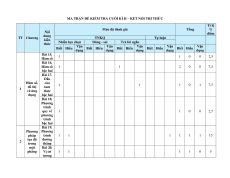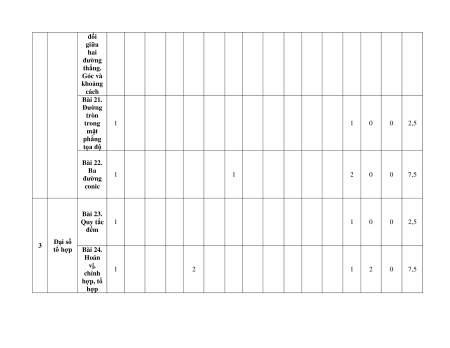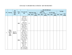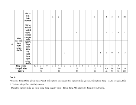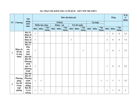 Mức độ đánh giá Tổng % Nội điểm dung TT Chương TNKQ Tự luận kiến Nhiều lựa chọn Đúng - sai Trả lời ngắn thức Vận Vận Vận Vận Vận Biết Hiểu Biết Hiểu Biết Hiểu Biết Hiểu Biết Hiểu dụng dụng dụng dụng dụng Bài 15. 1 1 0 0 2,5 Hàm số Bài 16. Hàm số 1 1 2 0 0 7,5 bậc hai Bài 17. Dấu Hàm số, của đồ 1 1 1 0 1 7,5 thị tam 1 và ứng thức dụng bậc hai Bài 18. Phương trình quy về 1 1 0 0 2,5 phương trình bậc hai Bài 19. Phương Phương pháp trình 1 1 1 1 1 1 15 tọa độ đường 2 trong thẳng mặt Bài 20. phẳng Vị trí 1 1 1 1 0 5 tương đối giữa hai đường thẳng. Góc và khoảng cách Bài 21. Đường tròn trong 1 1 0 0 2,5 mặt phẳng tọa độ Bài 22. Ba đườ 1 1 2 0 0 7,5 ng conic Bài 23. Quy tắc 1 1 0 0 2,5 đếm Đại số 3 tổ hợp Bài 24. Hoán vị, 1 2 1 2 0 7,5 chỉnh hợp, tổ hợp Bài 25. Nhị 2 2 1 2 3 0 20 thức Newton Bài 26. Biến cố và định nghĩa 1 0 1 0 5 cổ điển của xác Tính suất xác suất Bài 27. theo 4 đị Thực nh nghĩa hành tính cổ điển xác 2 1 0 0 3 15 suất theo định nghĩa cổ điển Tổng số câu 10 2 0 2 4 2 2 1 1 0 1 2 14 8 5 Tổng số điểm 3,0 2,0 2,0 3,0 4,0 3,0 3,0 10 Tỉ lệ % 30 20 20 30 40 30 30 100 Lưu ý: