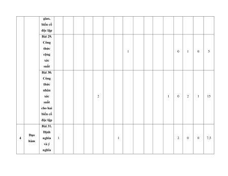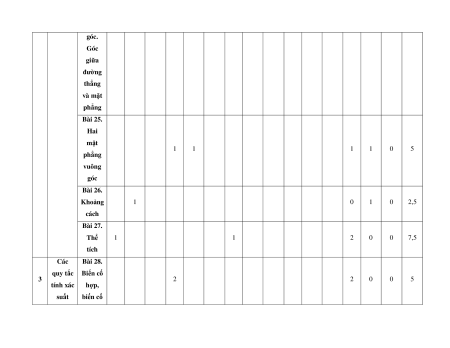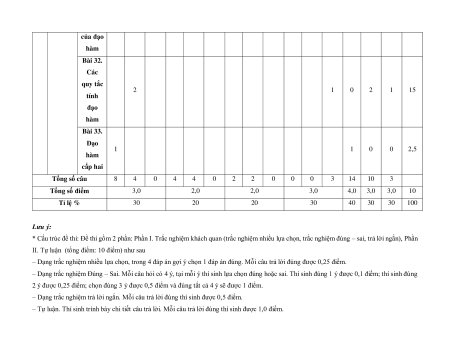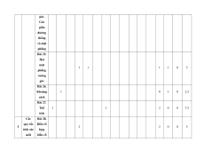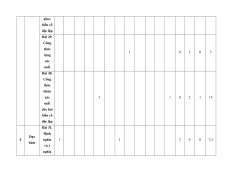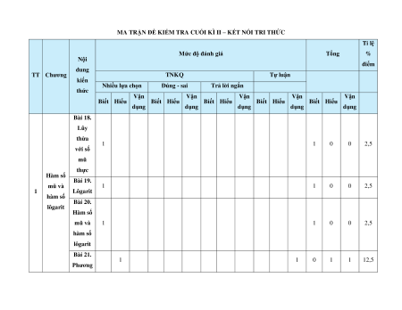 Mức độ đánh giá Tổng % Nội điểm dung TT Chương TNKQ Tự luận kiến Nhiều lựa chọn Đúng - sai Trả lời ngắn thức Vận Vận Vận Vận Vận Biết Hiểu Biết Hiểu Biết Hiểu Biết Hiểu Biết Hiểu dụng dụng dụng dụng dụng Bài 18. Lũy thừa 1 1 0 0 2,5 với số mũ thực Hàm số Bài 19. mũ và 1 1 0 0 2,5 1 Lôgarit hàm số Bài 20. lôgarit Hàm số mũ và 1 1 0 0 2,5 hàm số lôgarit Bài 21. 1 1 0 1 1 12,5 Phương trình, bất phương trình mũ và lôgarit Bài 22. Hai đường 1 1 1 1 0 7,5 thẳng vuông Quan góc hệ Bài 23. vuông Đường 2 góc thẳng trong vuông 1 1 1 1 0 5 không góc với gian mặt phẳng Bài 24. Phép 1 1 0 0 2,5 chiếu vuông góc. Góc giữa đường thẳng và mặt phẳng Bài 25. Hai mặt 1 1 1 1 0 5 phẳng vuông góc Bài 26. Khoảng 1 0 1 0 2,5 cách Bài 27. Thể 1 1 2 0 0 7,5 tích Các Bài 28. quy tắc Biến cố 3 2 2 0 0 5 tính xác hợp, suất biến cố giao, biến cố độc lập Bài 29. Công thức 1 0 1 0 5 cộng xác suất Bài 30. Công thức nhân xác 2 1 0 2 1 15 suất cho hai biến cố độc lập Bài 31. Định Đạo 4 nghĩa 1 1 2 0 0 7,5 hàm và ý nghĩa