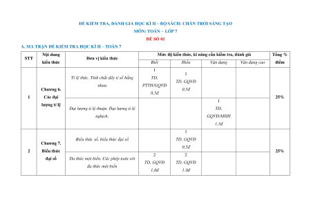 ĐỀ KIỂM TRA, ĐÁNH GIÁ HỌC KÌ II – BỘ SÁCH: CHÂN TRỜI SÁNG TẠO