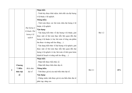 - Nhận biết được biểu thức đại số. 7. Biểu Biểu thức Thông hiểu: 2 Bài 2.1 25% thức đại đại số