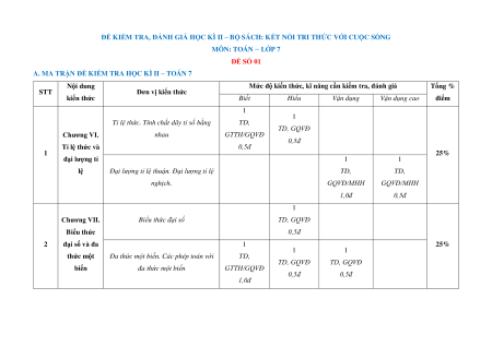 MÔN: TOÁN − LỚP 7 ĐỀ SỐ 01
