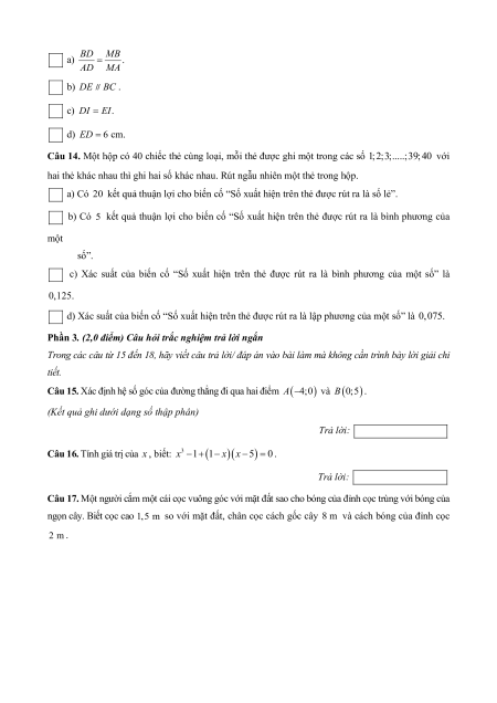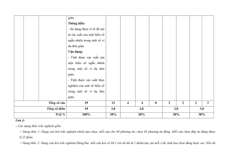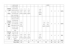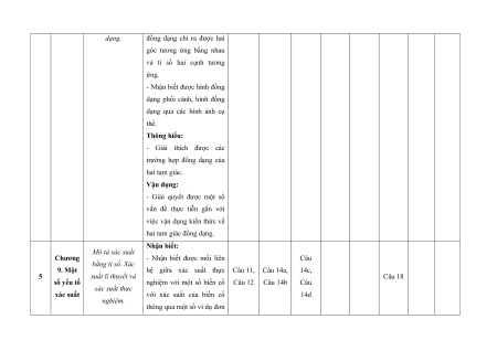 đồng dạng của hai dạng GTTH) GQVĐ) GQVĐ) tam giác vuông. Hai hình đồng dạng. Chương Mô tả xác suất 2 2 2 1 9. Một bằng tỉ số. Xác 0,5đ 0,5đ 0,5đ 0,5đ 5 số yếu suất lí thuyết và 4 2 1 20% (TD, (TD, (TD, (TD, tố xác xác suất thực GTTH) GQVĐ) GQVĐ) GQVĐ) suất nghiệm. Tổng số câu 12 4 4 0 2 2 2 3 16 8 5 100%