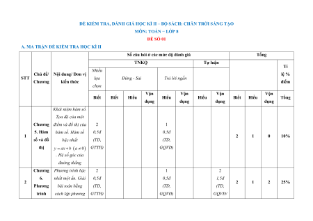 ĐỀ KIỂM TRA, ĐÁNH GIÁ HỌC KÌ II – BỘ SÁCH: CHÂN TRỜI SÁNG TẠO MÔN: TOÁN − LỚP 8 ĐỀ SỐ 01