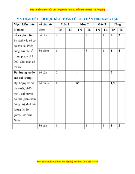 MA TRẬN ĐỀ CUỐI HỌC KÌ 2 - TOÁN LỚP 2 – CHÂN TRỜI SÁNG TẠO