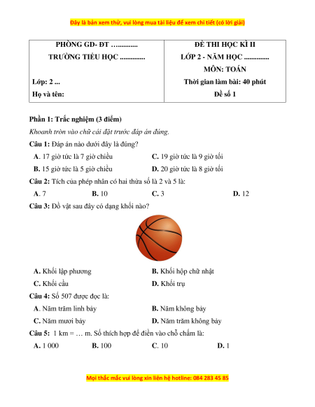 Câu 5: 1 km = … m. Số thích hợp để điền vào chỗ chấm là: A. 1 000 B. 100 C. 10 D. 1