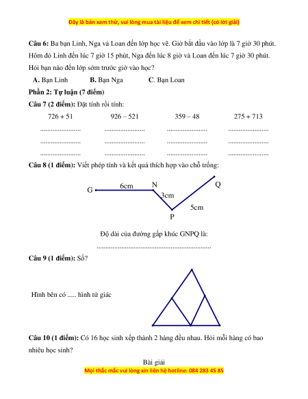 Câu 6: Ba bạn Linh, Nga và Loan đến lớp học vẽ. Giờ bắt đầu vào lớp là 7 giờ 30 phút.