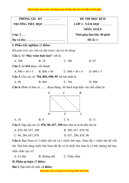Câu 1. Số “Bảy trăm linh tám” viết là: A. 708 B. 78 C. 780 D. 87