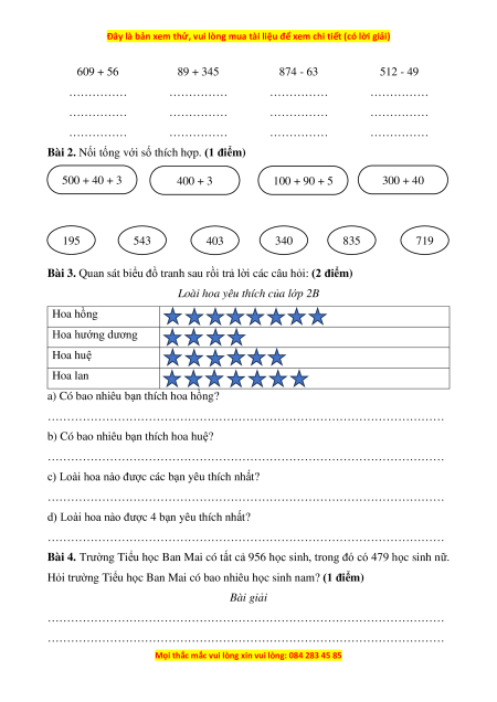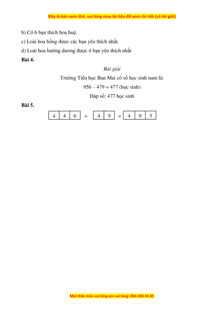 Bài 4. Trường Tiểu học Ban Mai có tất cả 956 học sinh, trong đó có 479 học sinh nữ.