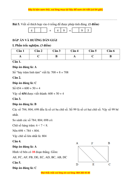 Câu 2. Số 654 được viết thành: A. 600 + 40 + 5 B. 600 + 40 C. 600 + 50 + 4 D. 600 + 5