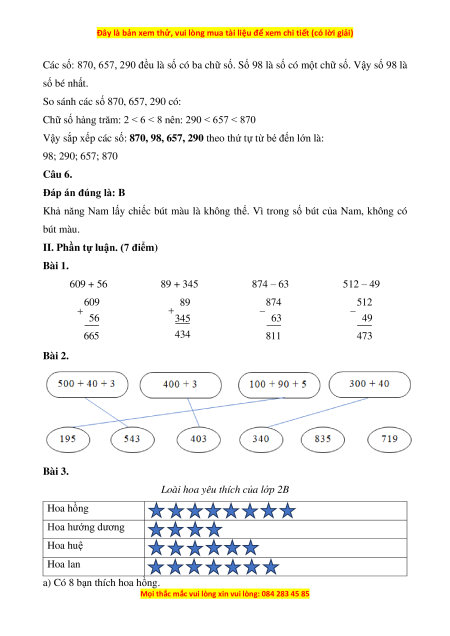 Vậy sắp xếp các số: 870, 98, 657, 290 theo thứ tự từ bé đến lớn là: 98; 290; 657; 870 Câu 6.