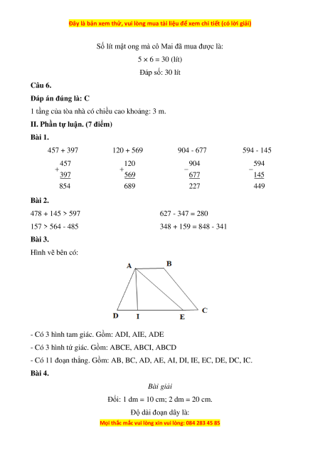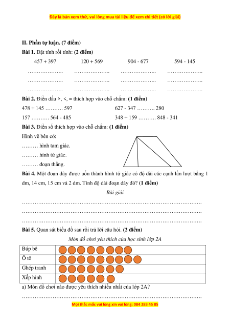 II. Phần tự luận. (7 điểm) Bài 1. 609 + 56 89 + 345 874 – 63 512 – 49 609 89 874 512 + + − − 56 345 63 49 665 434 811 473 Bài 2. Bài 3.