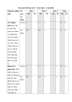 Năng lực, phẩm Số Mức 1 Mức 2 Mức 3 Tổng chất câu, TN TL TN TL TN TL TN TL số điểm Số và phép Số câu 1 1 1 2 1 tính: Đọc, viết, so sánh, làm Số 0,5 0,5 2 1 2