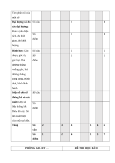 Đại lượng và đo Số câu 1 1 các đại lượng: Đơn vị đo diện Số 1 1 tích, đo thời điểm gian, đo khối lượng. Hình học: Góc Số câu 1 1 nhọn, góc tù, Số 1 1 góc bẹt. Hai điểm đường thẳng vuông góc, hai đường thẳng song song. Hình thoi, hình bình hành. Một số yếu tố Số câu thống kê và xác suất: Dãy số Số liệu thống kê. điểm Biểu đồ cột. Số lần xuất hiện của một sự kiện. Tổng Số 2 4 4 1 6 5 câu Số 1 2 6 1 3 7 điểm PHÒNG GD- ĐT … ĐỀ THI HỌC KÌ II