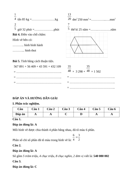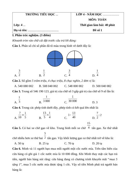 tròn số tự nhiên. điểm Các phép tính với số tự nhiên. Nhân (chia) với 10, 100, 1 000,... Nhân (chia) với số có 2 chữ số. Tìm số trung bình cộng. Bài toán liên quan đến rút về đơn vị. Phân số và Số câu 1 3 1 1 4 2 phép tính: Tính chất cơ bản của phân số. Rút gọn Số 0,5 1,5 2 1 2 3 phân số. Quy điểm đồng mẫu số các phân số. So sánh phân số. Phép cộng, trừ, nhân chia phân số. Tìm phân số của một số