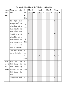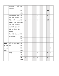 lường tích hình tam giác, điểm hình thang, hình tròn Xăng-ti-mét khối. Số 1 1 Đề-xi-mét khối. câu Mét khối. Số 0,5 0,5 điểm Hình hộp chữ nhật, Số 1 2 1 3 1 hình lập phương. câu Diện tích xung Số 0,5 1 1 1,5 1 quanh, diện tích điểm toàn phần, thể tích của hình hộp chữ nhật và hình lập phương. Các phép tính số Số 1 1 đo thời gian câu Số 1 1 điểm