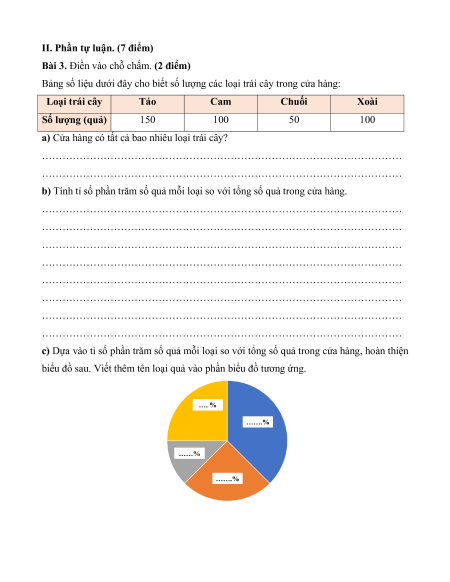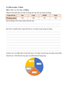 Bảng số liệu dưới đây cho biết số lượng các loại trái cây trong cửa hàng: Loại trái cây Táo Cam Chuối Xoài Số lượng (quả) 150 100 50 100