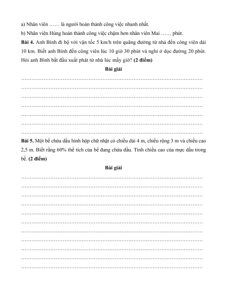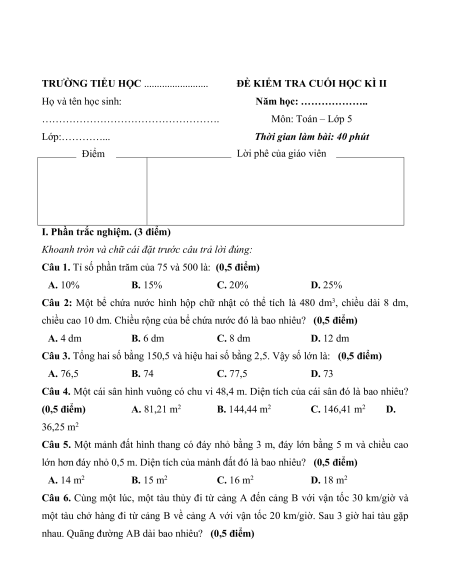 ……………………………………………. Môn: Toán – Lớp 5 Lớp:…………. .