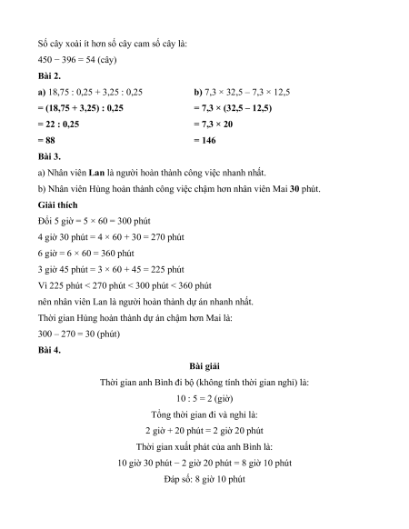 Thời gian hoàn thành công việc của từng nhân viên trong công ty được thống kê ở bảng dưới đây: Tên nhân viên Hùng Mai Bình Lan Thời gian 5 giờ 4 giờ 30 phút 6 giờ 3 giờ 45 phút