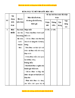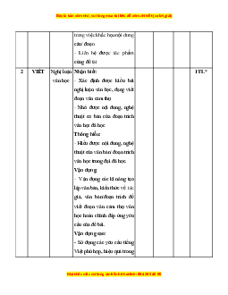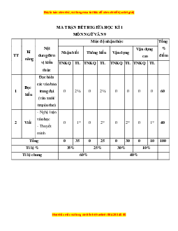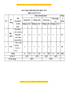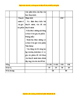 Mức độ nhận thức Tổng Nội Vận dụng % Kĩ Nhận biết Thông hiểu Vận dụng TT dung/đơn cao điểm năng vị kiến TNKQ TL TNKQ TL TNKQ TL TNKQ TL thức Đọc hiểu các văn bản Đọc 1 trung đại 0 2 ½ 0 2 ½ 0 0 0 0 60 hiểu (văn xuôi/ truyện thơ) - Nghị luận văn học 2 Viết 0 1* 0 2* 0 2* 0 1* 40 - Thuyết minh Tổng 0 35 0 25 0 30 0 10 100 Tỉ lệ % 35% 25% 30% 10% Tỉ lệ chung 60% 40%