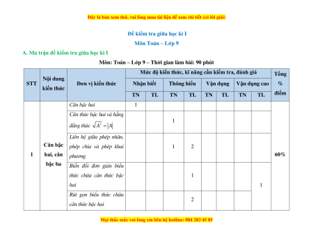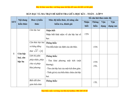 BẢN ĐẶC TẢ MA TRẬN ĐỀ KIỂM TRA GIỮA HỌC KÌ I – TOÁN – LỚP 9