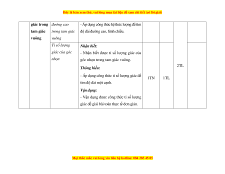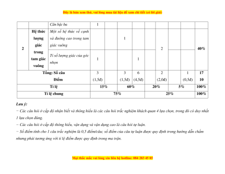 Tỉ số lượng giác của góc tam giác 1 1 nhọn vuông Tổng: Số câu 3 3 6 2 1 17 Điểm (1,5đ) (1,5đ) (4,5đ) (2,0đ) (0,5đ) 10 Tỉ lệ 15% 60% 20% 5% 100% Tỉ lệ chung 75% 25% 100% Lưu ý: