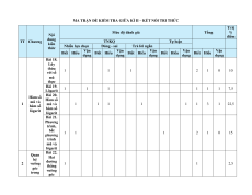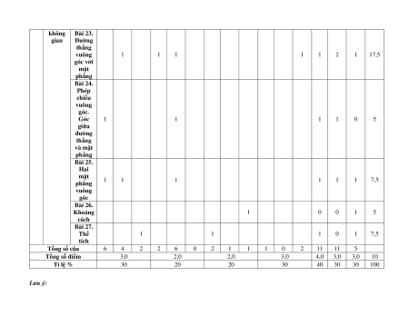 Mức độ đánh giá Tổng % Nội điểm dung TT Chương TNKQ Tự luận kiến Nhiều lựa chọn Đúng - sai Trả lời ngắn thức Vận Vận Vận Vận Vận Biết Hiểu Biết Hiểu Biết Hiểu Biết Hiểu Biết Hiểu dụng dụng dụng dụng dụng Bài 18. Lũy thừa 1 1 1 2 1 0 10 với số mũ thực Bài 19. 1 1 1 1 1 1 7,5 Lôgarit Bài 20. Hàm số mũ và Hàm số 1 mũ và 1 1 1 1 1 1 3 1 22,5 hàm số hàm số lôgarit lôgarit Bài 21. Phương trình, bất phương 1 1 1 2 1 0 15 trình mũ và lôgarit Bài 22. Quan Hai hệ đường 2 vuông 1 1 2,5 thẳng góc vuông trong góc không Bài 23. gian Đường thẳng vuông 1 1 1 1 1 2 1 17,5 góc với mặt phẳng Bài 24. Phép chiếu vuông góc. Góc 1 1 1 1 0 5 giữa đường thẳng và mặt phẳng Bài 25. Hai mặt 1 1 1 1 1 1 7,5 phẳng vuông góc Bài 26. Khoảng 1 0 0 1 5 cách Bài 27. Thể 1 1 1 0 1 7,5 tích Tổng số câu 6 4 2 2 6 0 2 1 1 1 0 2 11 11 5 Tổng số điểm 3,0 2,0 2,0 3,0 4,0 3,0 3,0 10 Tỉ lệ % 30 20 20 30 40 30 30 100 Lưu ý: