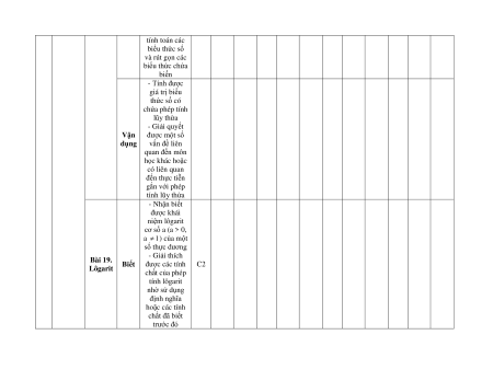 Mức độ đánh giá Nội TNKQ Tự luận dung Mức Yêu cầu cần TT Chương Nhiều lựa chọn Đúng - sai Trả lời ngắn kiến độ đạt thức Vận Vận Vận Vận Biết Hiểu Biết Hiểu Biết Hiểu Biết Hiểu dụng dụng dụng dụng Nhận biết được khái niệm lũy thừa với số mũ nguyên của một số thực Biết khác 0; lũy C1 C1 thừa với số mũ hữu tỉ và lũy thừa với số mũ thực Bài 18. của một số Hàm số Lũy mũ và thực dương thừa 1 - Giải thích hàm số với số được các tính lôgarit mũ chất của phép thực tính lũy thừa với số mũ nguyên, lũy thừa với số Hiểu mũ hữ C1c u tỉ và lũy thừa với số mũ thực - Sử dụng được tính chất của phép tính lũy thừa trong