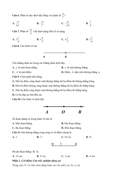 V. Phân sánh phân số. TD, TD, TD, TD, 2 số và số 3 1 2 22,5% Hỗn số dương. GTTH GQVĐ GQVĐ GQVĐ thập Phép cộng, 0,75đ 0,5đ 0,5đ 0,5đ phân phép trừ phân số Điểm. Đường thẳng. Chương Hai đường 5 2 1 1 1 2 VI. thẳng cắt TD, TD, TD, TD, TD, TD, 3 Hình 7 3 1 37,5% nhau. Hai GTTH GTTH GQVĐ GQVĐ GQVĐ GQVĐ học đường thẳng 1,25đ 0,5đ 0,25đ 0,25đ 0,5đ 1,0đ phẳng song song. Đoạn thẳng. Tổng số câu 12 4 2 2 2 2 3 3 16 6 7 29