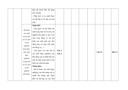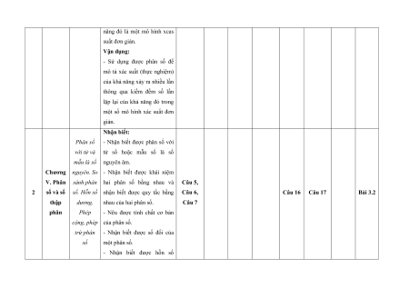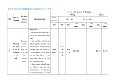 Số câu hỏi ở các mức độ đánh giá Tổng TNKQ Tự luận Tỉ Nội dung/ Nhiều Chủ đề/ lệ % STT Đơn vị kiến lựa Đúng - Sai Trả lời ngắn Chương điểm thức chọn Vận Vận Vận Vận Biết Biết Hiểu Hiểu Hiểu Biết Hiểu Tổng dụng dụng dụng dụng Thu thập, tổ chức, biểu 2 2 1 1 1 1 diễn, phân tích Chương TD, TD, TD, TD, TD, TD, và xử lí dữ IV. Một GTTH GTTH GQVĐ GQVĐ GQVĐ GQVĐ liệu. số yếu 0,5đ 0,5đ 0,25đ 0,25đ 0,5đ 0,5đ Biểu đồ cột 1 tố 6 2 4 40% kép. thống Mô hình xác kê và 2 1 1 suất trong một xác suất TD, TD, TD, số trò chơi và GTTH GQVĐ GQVĐ thí nghiệm đơn 0,5đ 0,5đ 0,5đ giản. Xác suất thực nghiệm trong một số trò chơi và thí nghiệm đơn giản. Phân số với tử và mẫu là số Chương nguyên. So 3 1 1 1