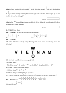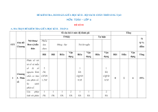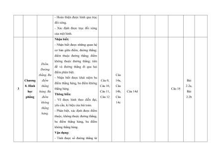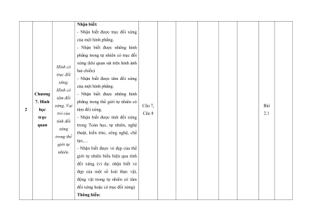Chương Hình có tâm 2 1 7. Hình đối xứng. TD, TD, 2 học Vai trò của 2 1 0 15% GTTH GQVĐ trực tính đối xứng 0,5đ 0,5đ quan trong thế giới tự nhiên. Điểm. Đường Chương 4 3 1 1 2 thẳng. Ba 8. Hình TD, TD, TD, TD, TD, 3 điểm thẳng 6 4 1 30% học GTTH GTTH GQVĐ GQVĐ GQVĐ hàng. Ba phẳng 1,0đ 0,75đ 0,25đ 0,5đ 1,0đ điểm không thẳng hàng. Tổng số câu 12 4 2 2 2 2 3 2 16 7 7 100%