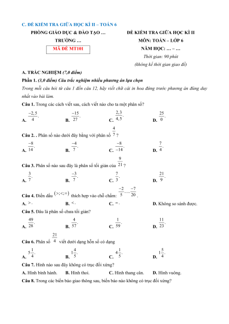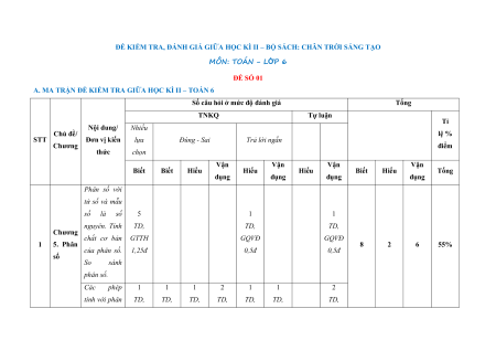 ĐỀ KIỂM TRA, ĐÁNH GIÁ GIỮA HỌC KÌ II – BỘ SÁCH: CHÂN TRỜI SÁNG TẠO MÔN: TOÁN − LỚP 6 ĐỀ SỐ 01