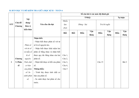 B. BẢN ĐẶC TẢ ĐỀ KIỂM TRA GIỮA HỌC KÌ II – TOÁN 6