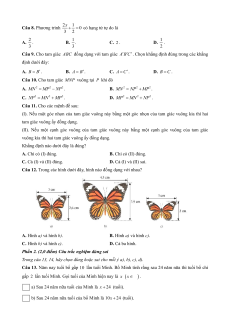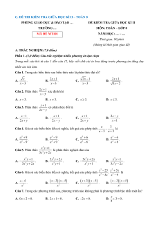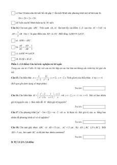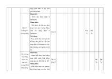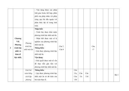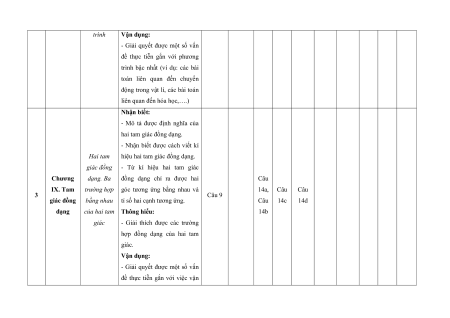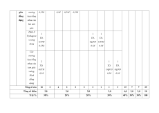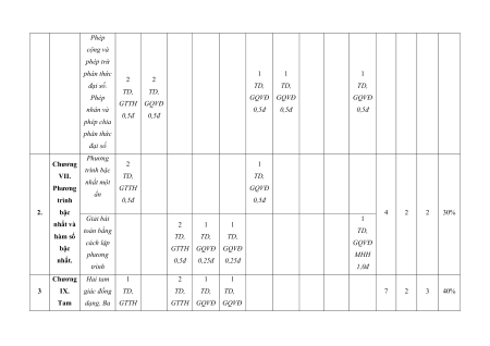 Số câu hỏi ở các mức độ đánh giá Tổng Nội TNKQ Tự luận Tỉ Chủ đề/ dung/ lệ % STT Nhiều lựa chọn Đúng - Sai Trả lời ngắn Chương Đơn vị điểm kiến thức Vận Vận Vận Vận Biết Hiểu Biết Hiểu Hiểu Biết Hiểu Biết Hiểu Tổng dụng dụng dụng dụng Phân thức Chương đại số. 2 VI. Tính chất TD, 1 Phân cơ bản 4 3 2 30% GTTH thức của phân 0,5đ đại số thức đại số. Phép cộng và phép trừ phân thức 1 1 1 2 2 đại số. TD, TD, TD, TD, TD, Phép GQVĐ GQVĐ GQVĐ GTTH GQVĐ nhân và 0,5đ 0,5đ 0,5đ 0,5đ 0,5đ phép chia phân thức đại số Phương Chương 2 1 trình bậc VII. TD, TD, nhất một Phương GTTH GQVĐ ẩn trình 0,5đ 0,5đ 2. bậc 4 2 2 30% Giải bài 1 nhất và 2 1 1 toán bằng TD, hàm số TD, TD, TD, cách lập GQVĐ bậc GTTH GQVĐ GQVĐ phương MHH nhất. 0,5đ 0,25đ 0,25đ trình 1,0đ Chương Hai tam 1 2 1 1 3 IX. giác đồng TD, TD, TD, TD, 7 2 3 40% Tam dạng. Ba GTTH GTTH GQVĐ GQVĐ giác trường 0,25đ 0,5đ 0,25đ 0,25đ đồng hợp bằng dạng nhau của hai tam giác Định lí 1 1 1 Pythagore TD, TD, TD, và ứng GTTH GQVĐ GTTH dụng 0,25đ 0,5đ 0,5đ Các trường hợp bằng 2 1 1 nhau của TD, TD, TD, tam giác GTTH GQVĐ GQVĐ vuông. 0,5đ 0,5đ 0,5đ Hình đồng dạng Tổng số câu 10 2 4 2 2 2 2 1 1 3 15 7 7 29 Tổng số điểm 3,0 2,0 2,0 3,0 4,0 3,0 3,0 10 Tỉ lệ % 30% 20% 20% 30% 40% 30% 30% 100
