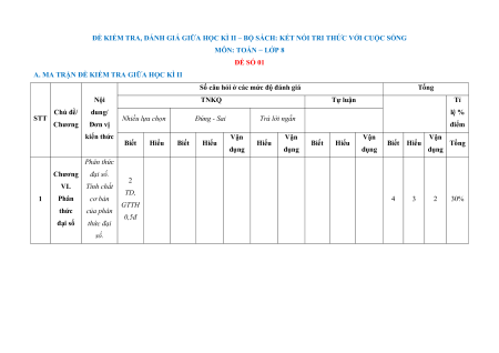 ĐỀ KIỂM TRA, ĐÁNH GIÁ GIỮA HỌC KÌ II – BỘ SÁCH: KẾT NỐI TRI THỨC VỚI CUỘC SỐNG MÔN: TOÁN − LỚP 8 ĐỀ SỐ 01