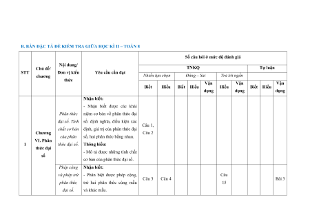 B. BẢN ĐẶC TẢ ĐỀ KIỂM TRA GIỮA HỌC KÌ II – TOÁN 8