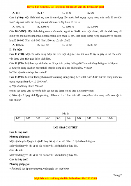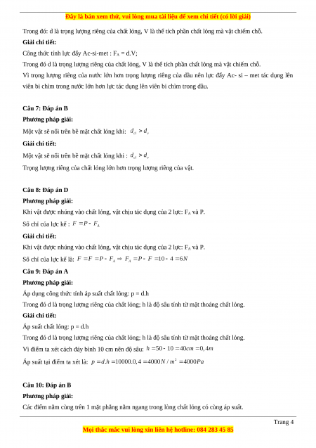 c) Nếu vật có dạng hình lập phương, chiều cao h = 10cm thì chiều cao phần chìm trong nước của vật là bao nhiêu? Đáp án 1-C 2-D 3-B 4-C 5-B 6-A 7-B 8-D 9-A 10-B LỜI GIẢI CHI TIẾT