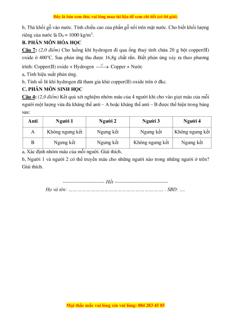 Câu 7: (2,0 điểm) Cho luồng khí hydrogen đi qua ống thuỷ tinh chứa 20 g bột copper(II)