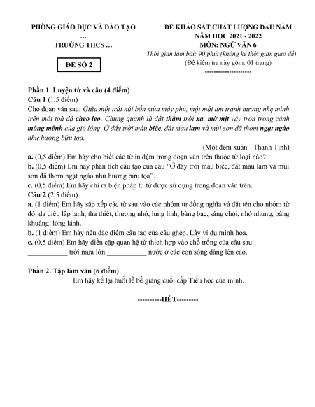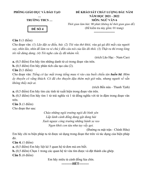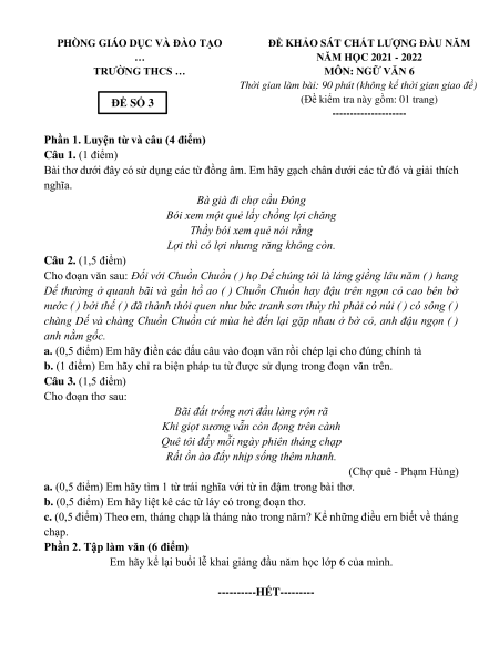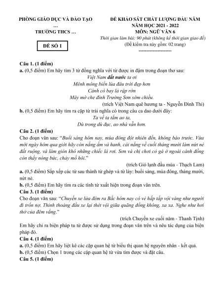 ĐỀ KHẢO SÁT CHẤT LƯỢNG ĐẦU NĂM … NĂM HỌC 2021 - 2022 TRƯỜNG THCS … MÔN: NGỮ VĂN 6