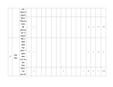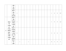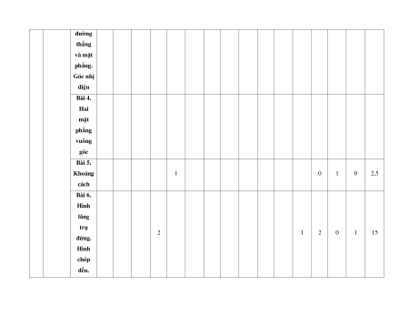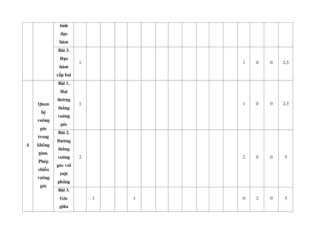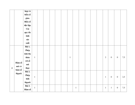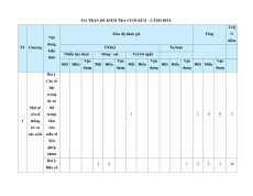 Mức độ đánh giá Tổng % Nội điểm dung TT Chương TNKQ Tự luận kiến Nhiều lựa chọn Đúng - sai Trả lời ngắn thức Vận Vận Vận Vận Vận Biết Hiểu Biết Hiểu Biết Hiểu Biết Hiểu Biết Hiểu dụng dụng dụng dụng dụng Bài 1. Các số đặc trưng đo xu Một số thế yếu tố trung 1 1 0 0 5 1 thống tâm kê và cho xác suất mẫu số liệu ghép nhóm Bài 2. 2 2 1 2 2 2 20 Biến cố hợp và biến cố giao. Biến cố độc lập. Các quy tắc tính xác suất Bài 1. Phép tính lũy thừa 1 1 2 0 0 7,5 với số Hàm số mũ mũ và 2 thực hàm số Bài 2. lôgarit Phép 1 1 0 0 2,5 tính lôgarit Bài 3. 1 1 1 1 0 7,5 Hàm số mũ. Hàm số lôgarit Bài 4. Phương trình, bất 1 0 1 0 2,5 phương mũ và lôgarit Bài 1. Định nghĩa đạo hàm. Ý 1 1 1 1 0 5 nghĩa Đạo 3 hình hàm học của đạo hàm Bài 2. Các 1 1 1 0 2 1 17,5 quy tắc tính đạo hàm Bài 3. Đạo 1 1 0 0 2,5 hàm cấp hai Bài 1. Hai đường Quan 1 1 0 0 2,5 thẳng hệ vuông vuông góc góc Bài 2. trong Đường 4 không thẳng gian. vuông 2 2 0 0 5 Phép góc với chiếu mặt vuông phẳng góc Bài 3. Góc 1 1 0 2 0 5 giữa