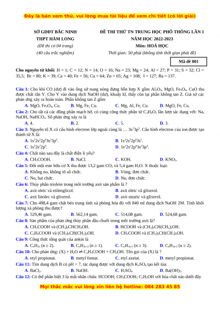 Đề thi thử Hóa học trường Hàm Long lần 1 năm 2023