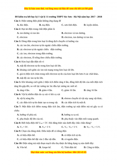 Đề kiểm tra hết học kỳ I vật lý 11 trường THPT Sóc Sơn - Hà Nội năm học 2017 - 2018