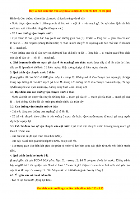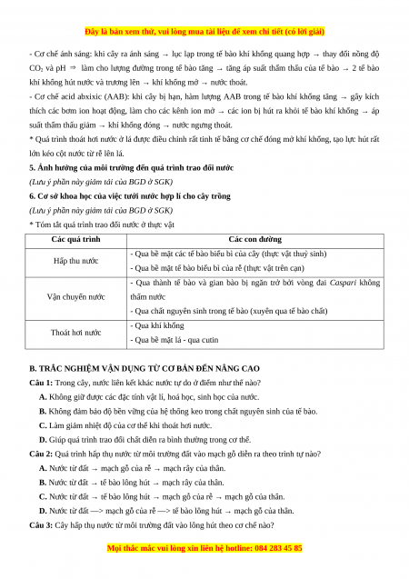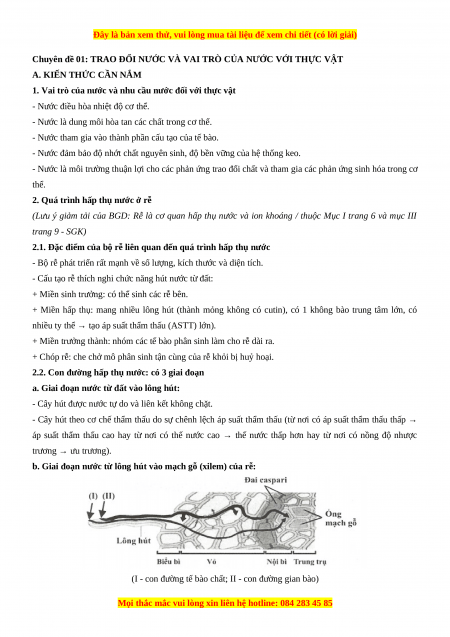 Chuyên đề 01: TRAO ĐỔI NƯỚC VÀ VAI TRÒ CỦA NƯỚC VỚI THỰC VẬT