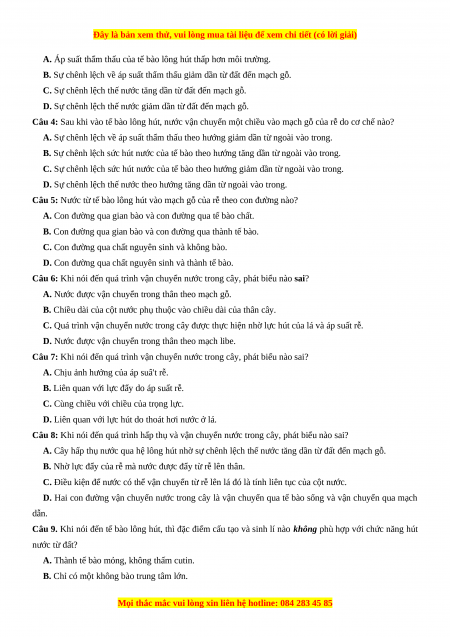 Câu 1: Trong cây, nước liên kết khác nước tự do ở điểm như thế nào?