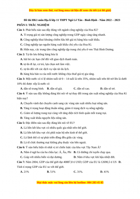 + Đề thi học kì 1 Địa Lý năm 2023 trường THPT Ngô Lê Tân - Bình Định;
